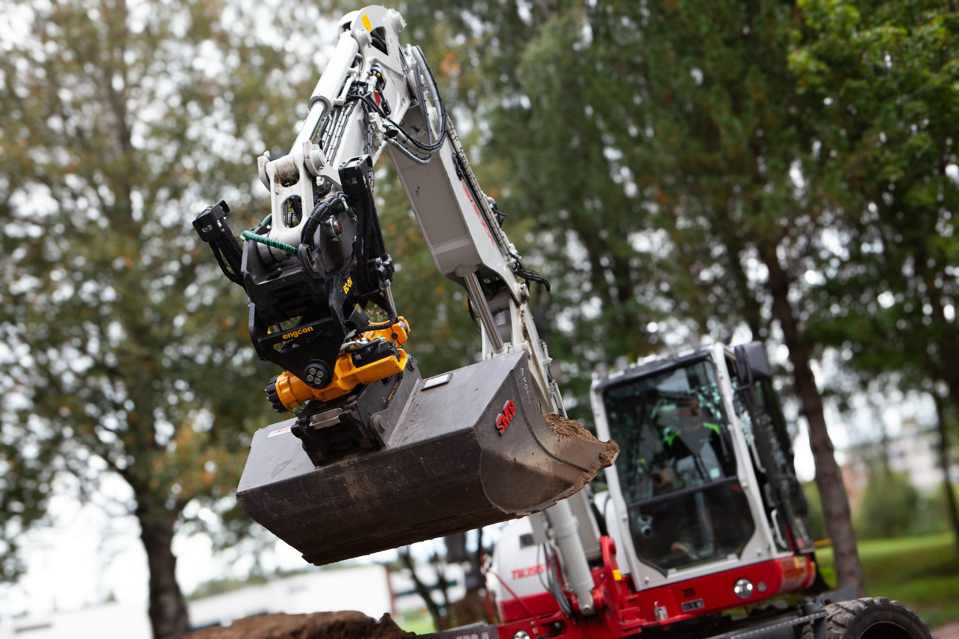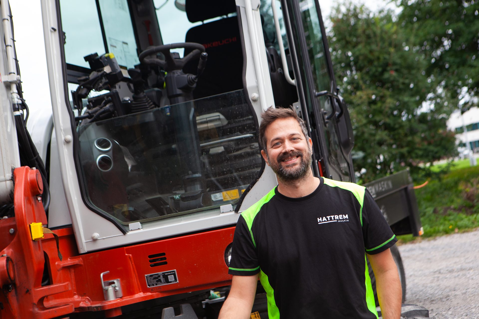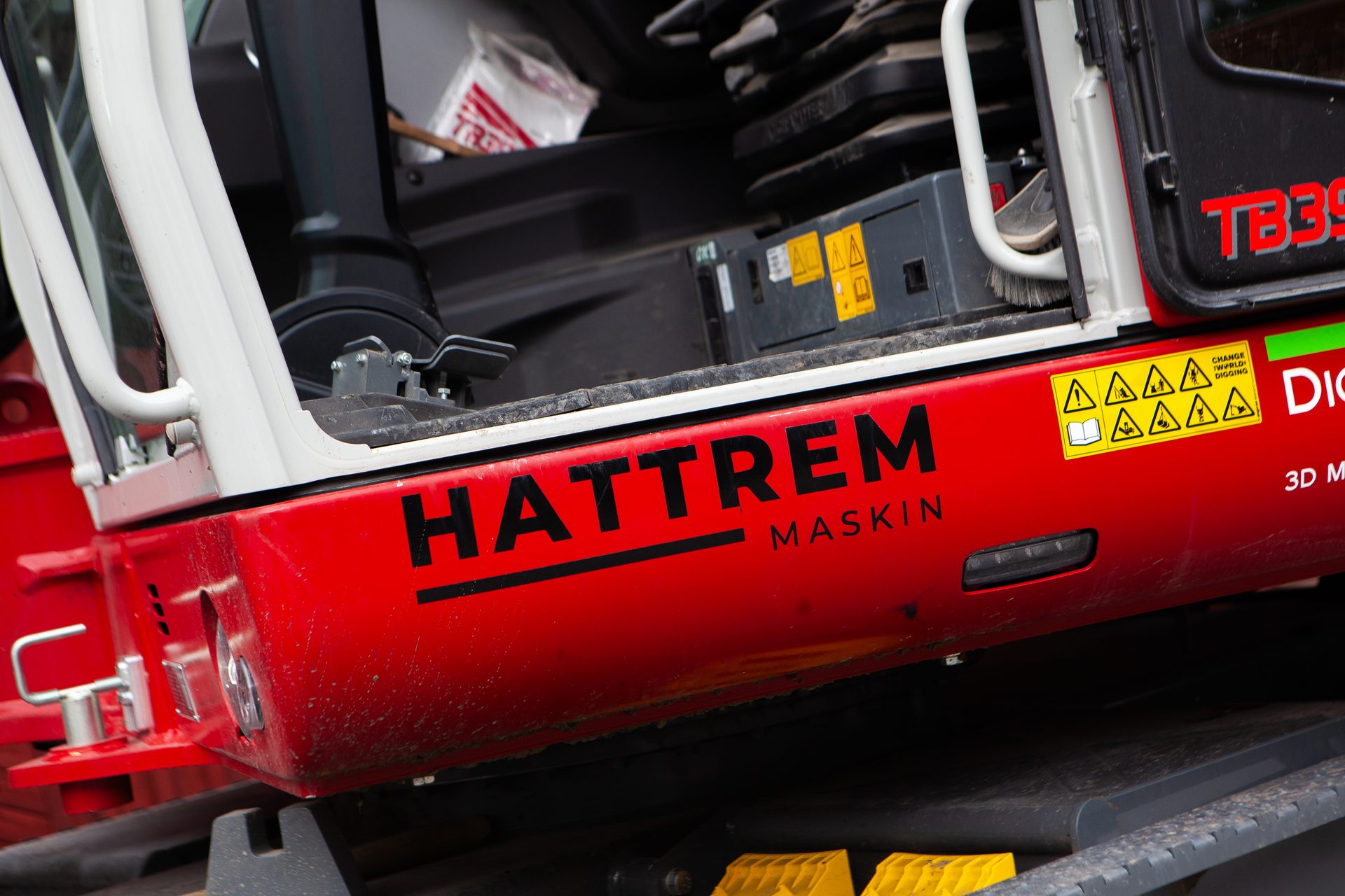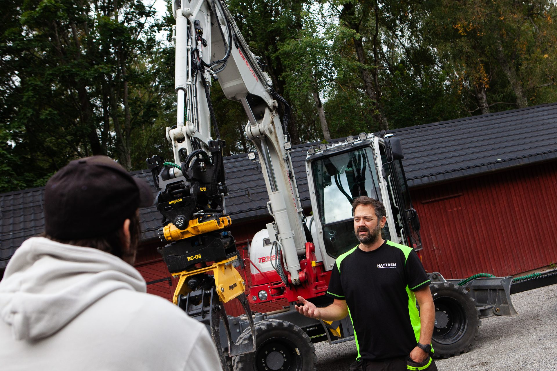 Ordene kommer fra Roy Hattrem (46). Etter 18 år som anleggsleder hos større entreprenører, startet han for seg selv for tre år siden. Siden har det gått slag i slag, og i sommer ble maskinparken rustet opp. En Takeuchi TB395W ble hentet inn som Hattrem Maskins nye spydspiss. Hjulgraveren på 11 tonn er utstyrt med engcons hurtigkoblingssystem EC-Oil.